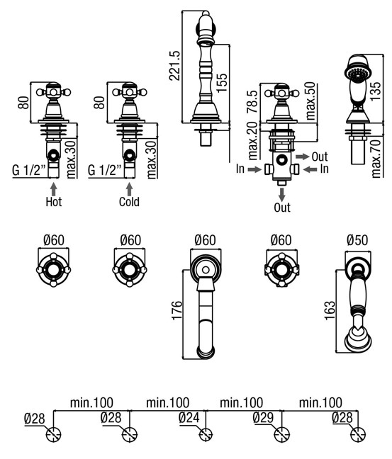 Alpi London Bateria wannowa na brzeg wanny 5-otworowa chrom LOPX01D30930CR