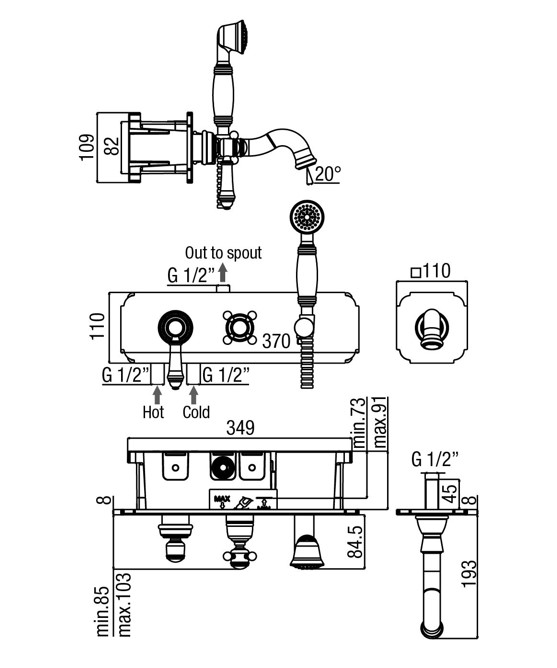 Alpi London Bateria prysznicowa podtynkowa z zestawem prysznicowym, przełącznikiem i wylewką chrom LO41L863VDCR