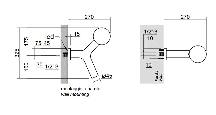 Prysznic mosiężny naścienny z oświetleniem LED, które włącza się automatycznie jednocześnie z dopływem wody i opóźnionym wyłączeniem 120 s,