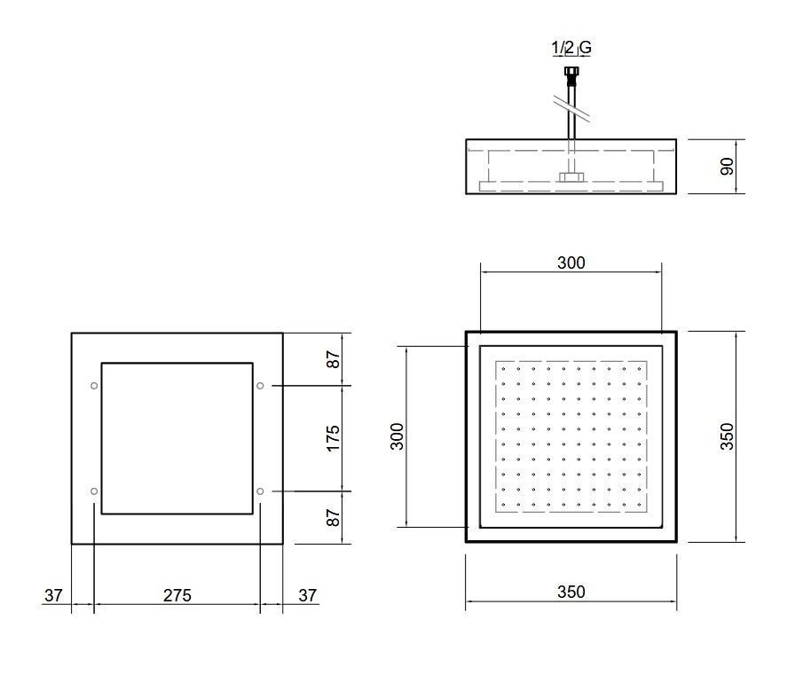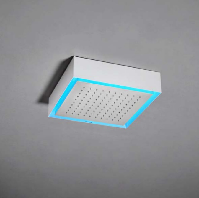 Deszczownica kwadratowa montowana do sufitu z zewnętrzną ramą ze stali dostępny w różnych wykończeniach, z możliwym oświetleniem LED RGB, wodoodpornym pilotem i transformatorem.