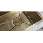 • System odpływowy, sterowany zaworem w kolorze złoto szczotkowane, z funkcją korka z sitkiem i pokrywą w kolorze zlewu