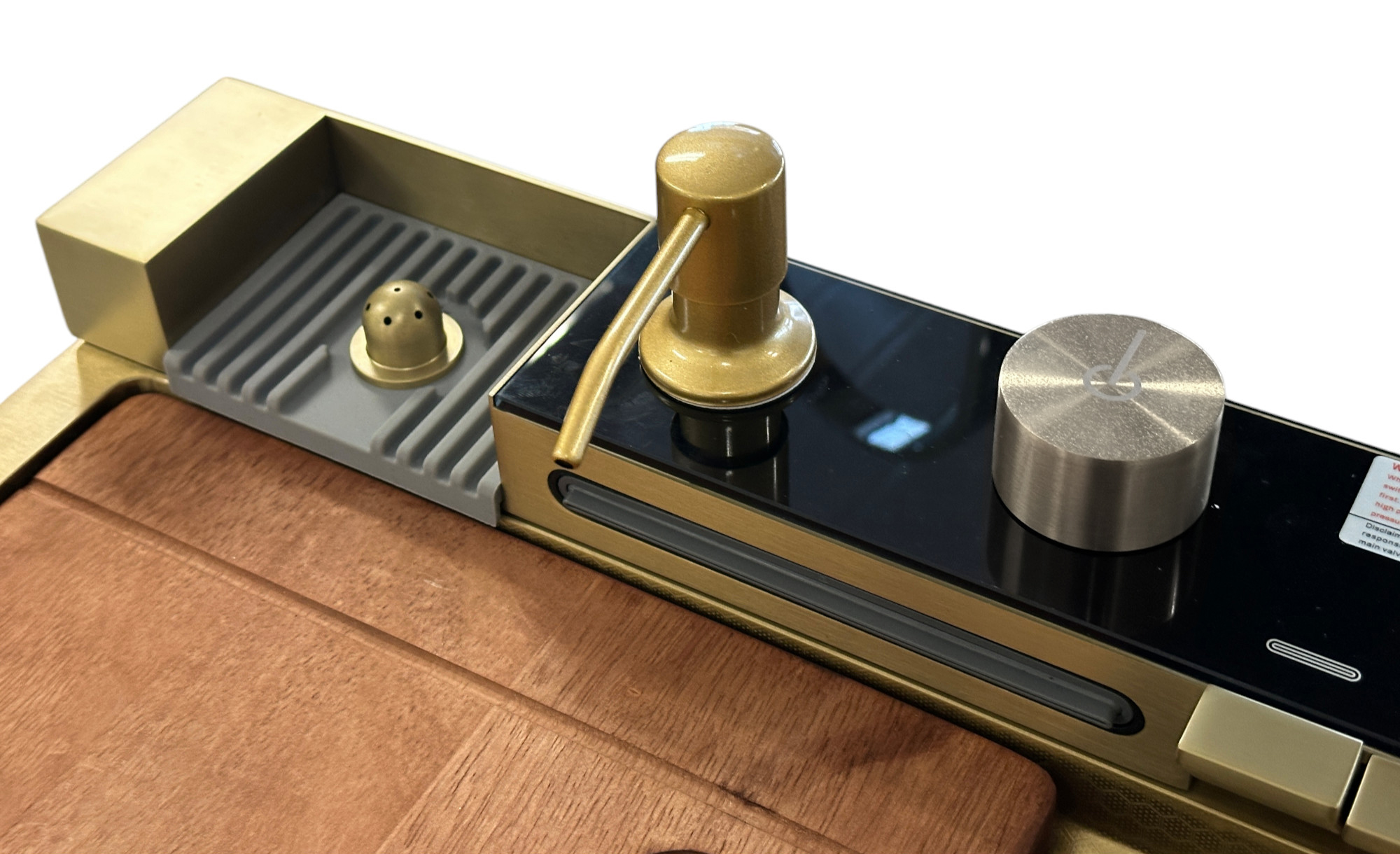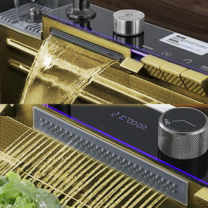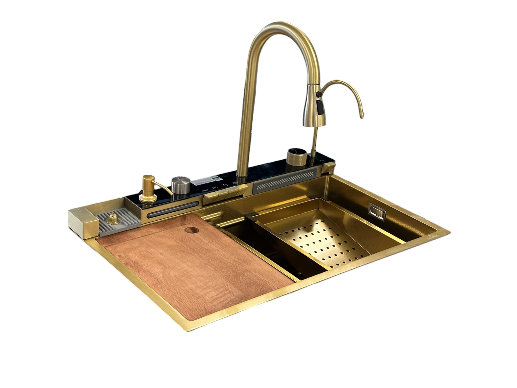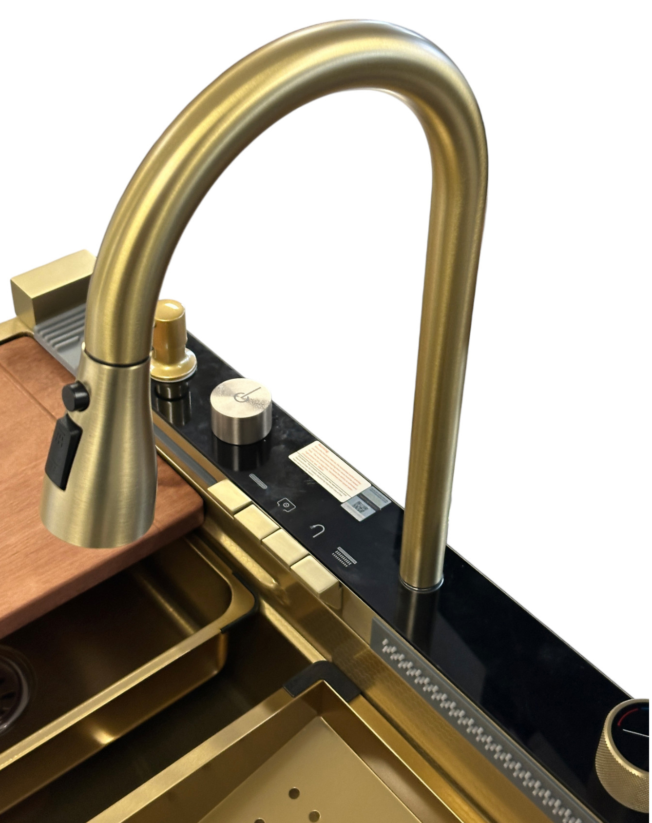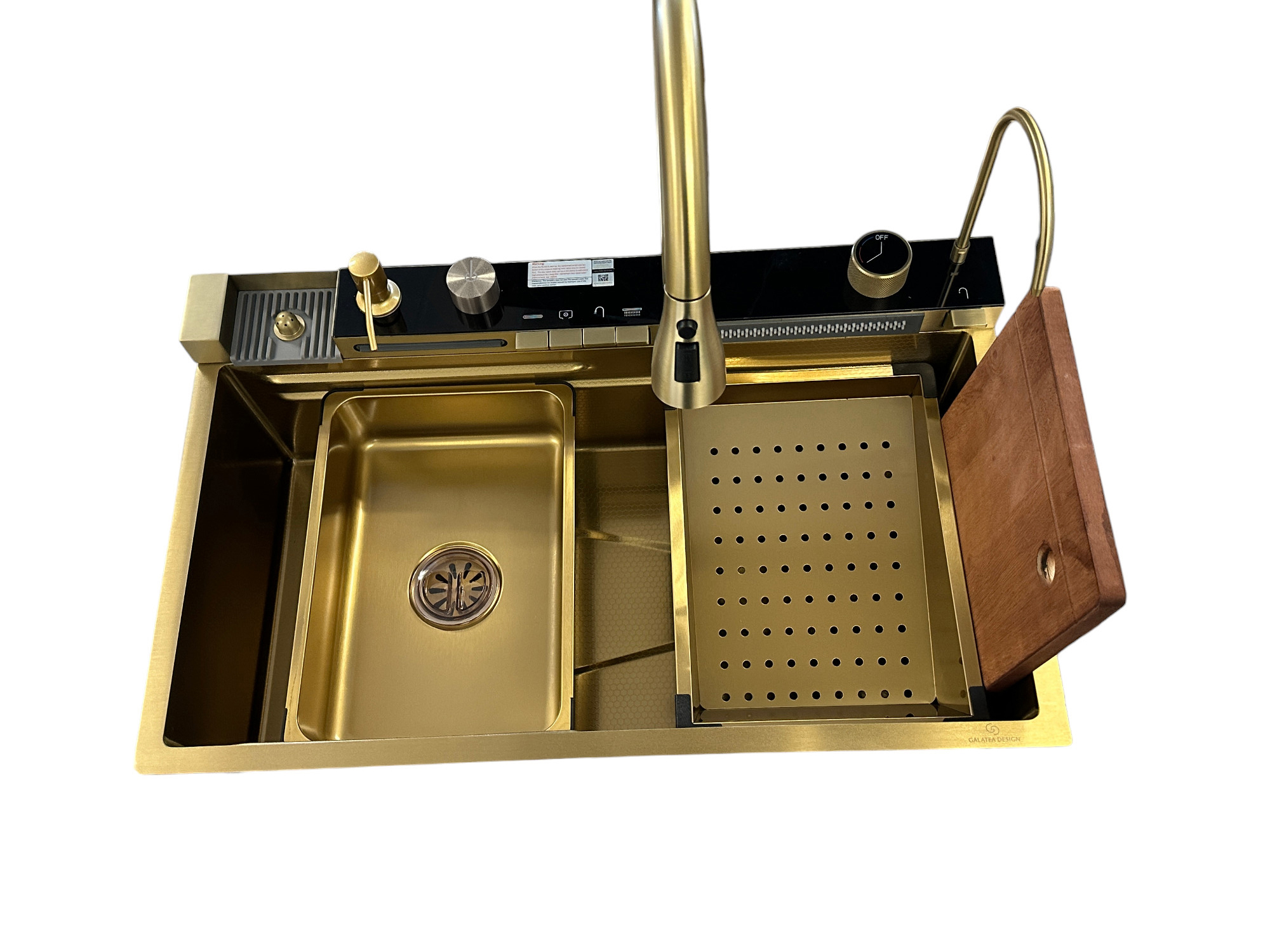 Galatea Design Modus S Zlew z wodospadem, myjką do szklanek, dozownikiem, bateria 3-funkcyjną ZESTAW 75x46 wpuszczany Gold GDP31OR