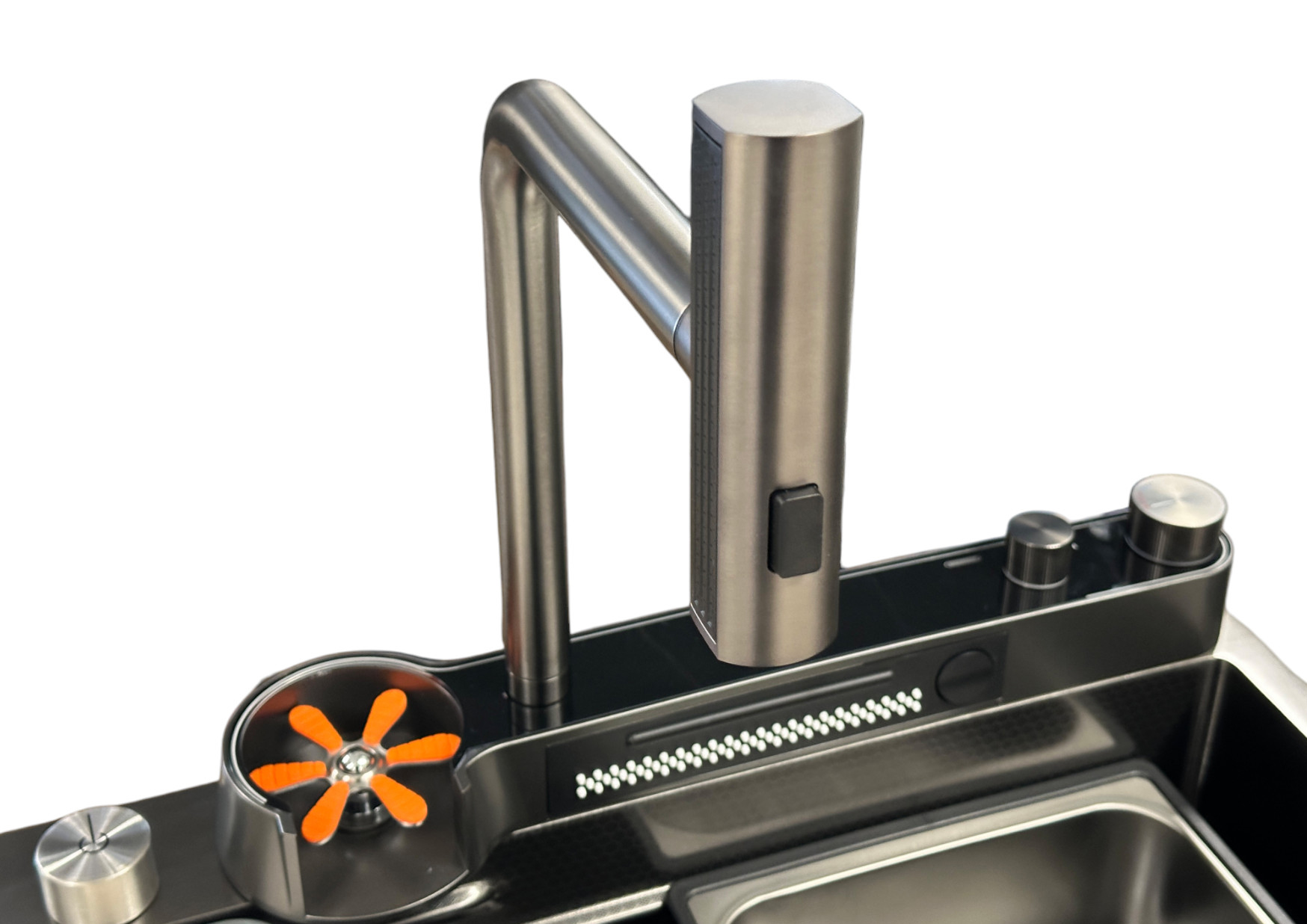 • Jednoczęściowy moduł sterujący czarny z 1 kranem, 1 kaskadą, myjką szklanek, przyciskami i pokrętłami