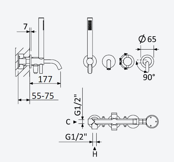 Wymiary:Średnica rozet: ∅6,5 cmGłębokość montażu: 5,5 - 7,5 cmWysięg wylewki: 17,7 cmZdjęcie przedstawia baterię w kolorze chrom, cena dotyczy koloru gunmetalCena dotyczy całego zestawu z elementem podtynkowym