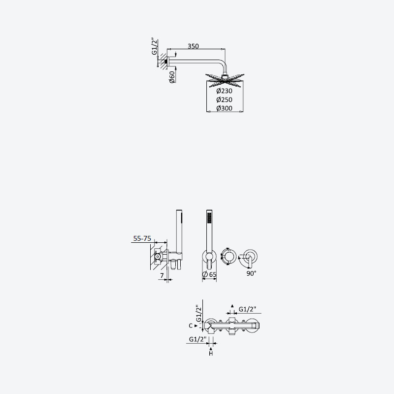 W skład zestawu wchodzi: deszczownica ścienna, bateria podtynkowa i zestaw natryskowa