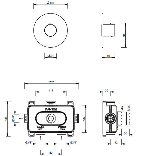 Fantini Sailing Bateria prysznicowa termostatyczna podtynkowa matt gunmetal pvd 67P5J200B+1900D400A
