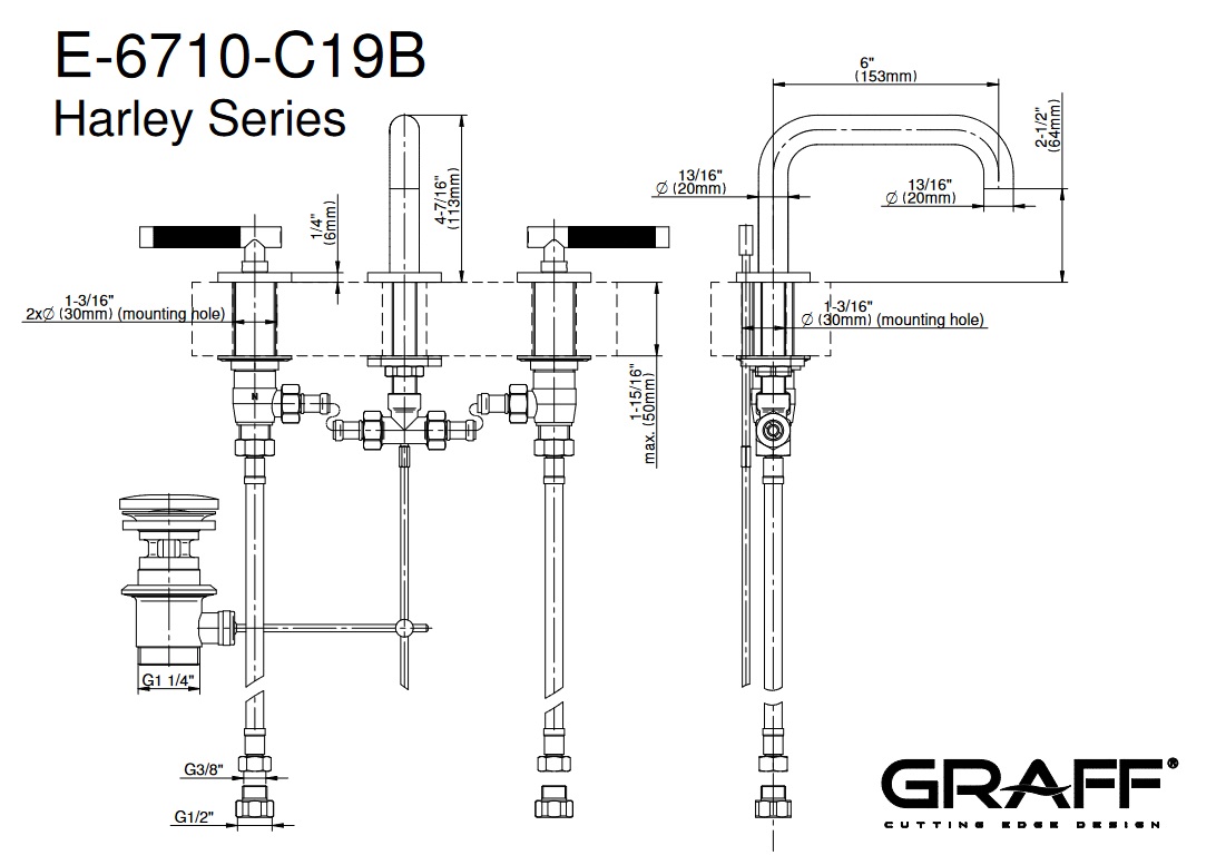 Graff Harley Bateria umywalkowa 3-otworowa z korkiem automatycznym Chrom E-6710-LM57B