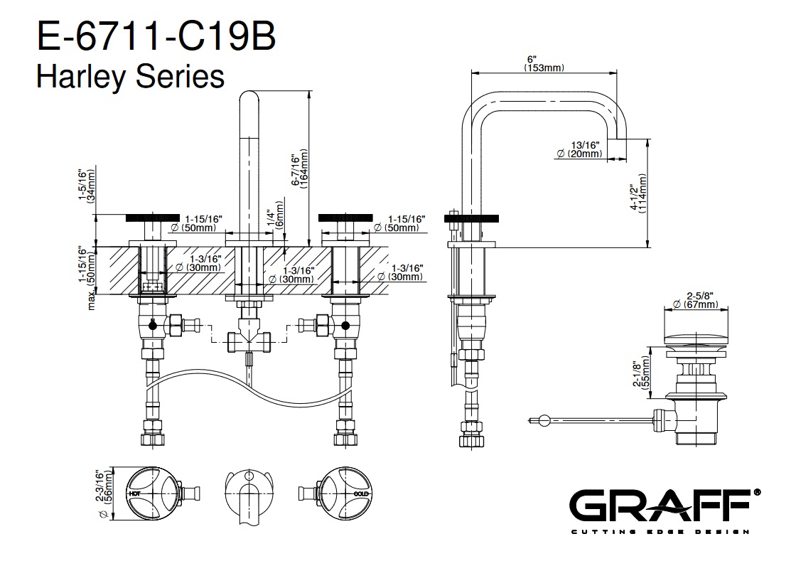 Graff Harley Bateria umywalkowa 3-otworowa z korkiem automatycznym Chrom E-6711-C19B