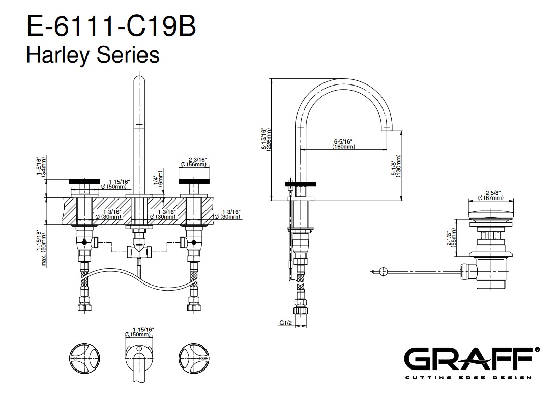 Graff Harley Bateria umywalkowa 3-otworowa z korkiem automatycznym Chrom E-6111-C19B