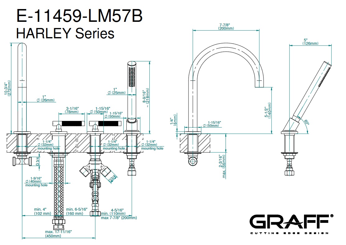 Graff Harley Bateria wannowa 4-otworowa PROGRESSIVE z zestawem prysznicowym Chrom E-11469-LM57B