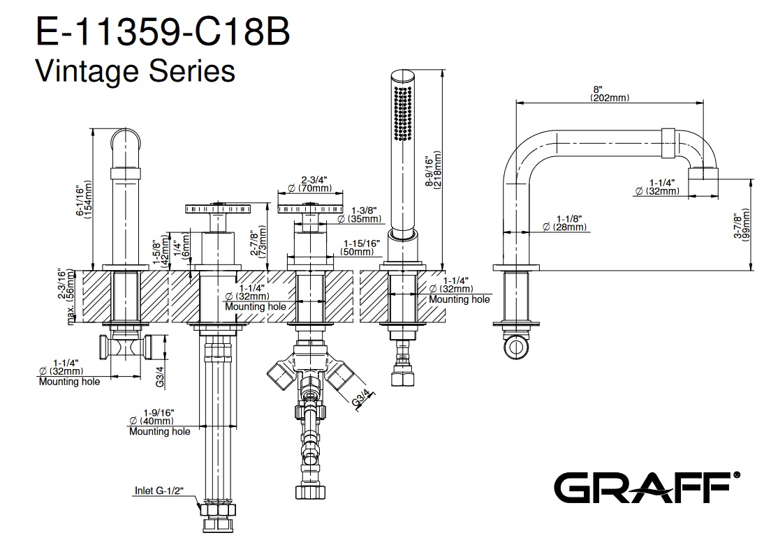 Graff Vintage Bateria wannowa 4-otworowa PROGRESSIVE z zestawem prysznicowym Chrom E-11359-C18B