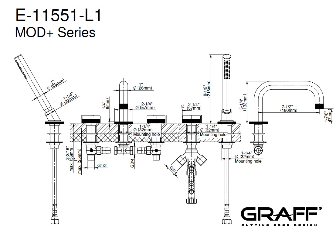 Graff MOD+ Bateria wannowa 5-otworowa z zestawem prysznicowym Chrom E-11551-R1-L1