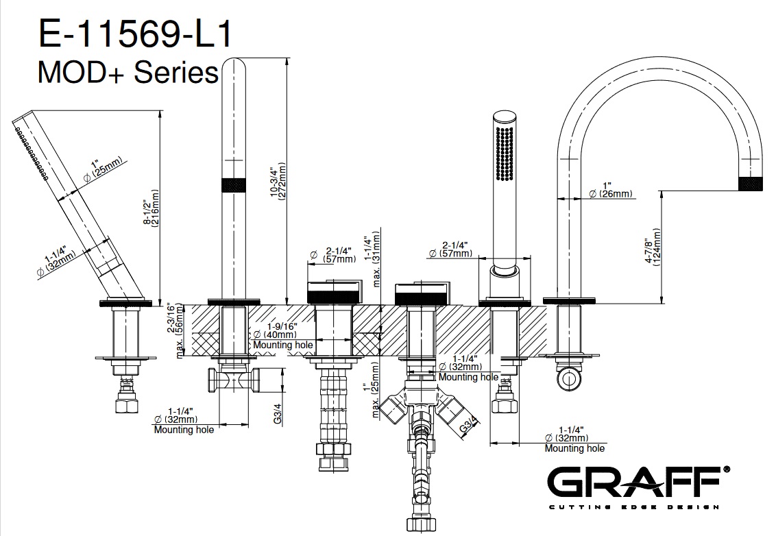 Graff MOD+ Bateria wannowa 4-otworowa nablatowa z zestawem prysznicowym PROGRESSIVE Chrom E-11569-R1-L1