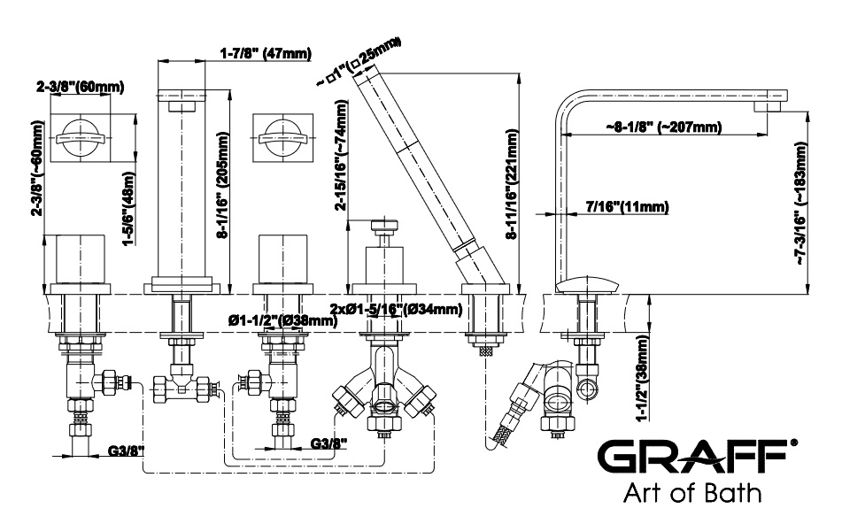 Graff Targa Bateria wannowa 5-otworowa z zestawem prysznicowym Chrom E-3657-C14B