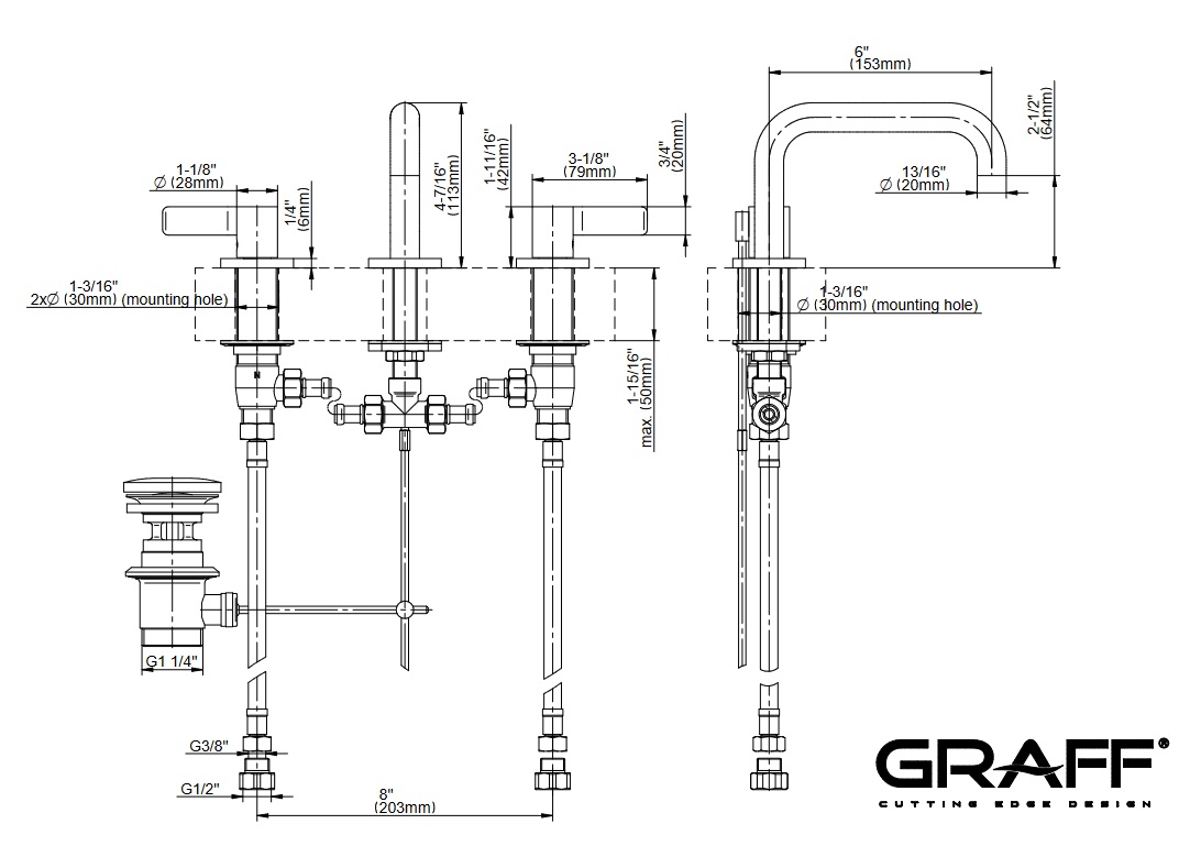Graff Terra Bateria umywalkowa 3-otworowa z korkiem automatycznym Chrom E-6710-LM46B