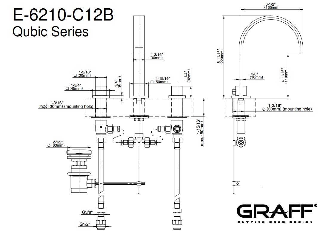 Graff Qubic Bateria umywalkowa 3-otworowa z korkiem automatycznym Chrom E-6210-C12B