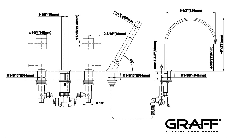 Graff Qubic Bateria wannowa 4-otworowa z zestawem prysznicowym Chrom E-6252-LM39B