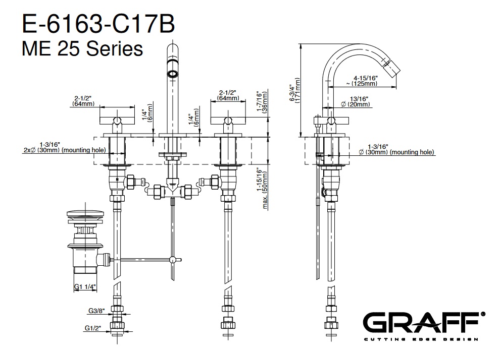 Graff M.E./M.E.25 Bateria bidetowa 3-otworowa z korkiem automatycznym Chrom E-6163-C17B