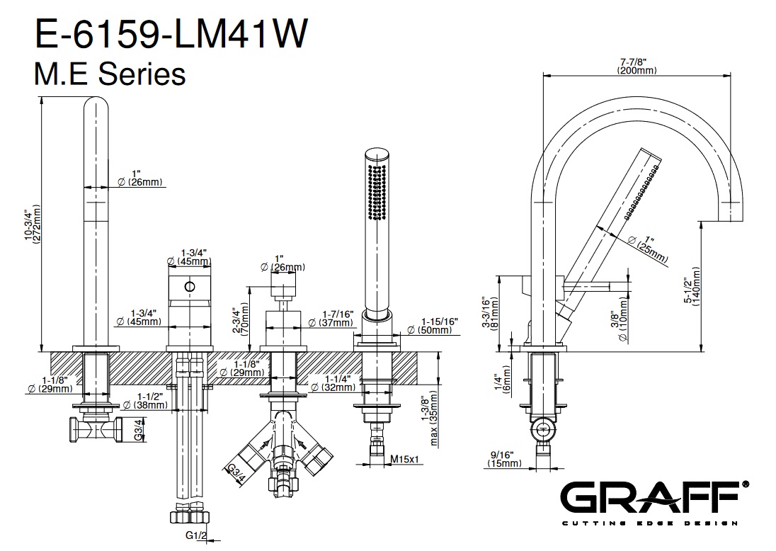Graff M.E./M.E.25 Bateria wannowa 3-otworowa z zestawem prysznicowym Chrom E-6159-LM41W
