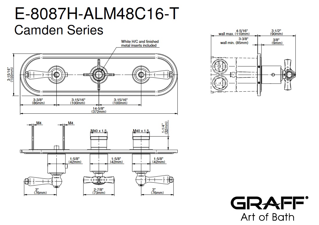 Graff Camden Bateria natryskowa termostatyczna 3-uchwytowa podtynkowa - element zewnętrzny Chrom E-8087H-ALM48C16-T