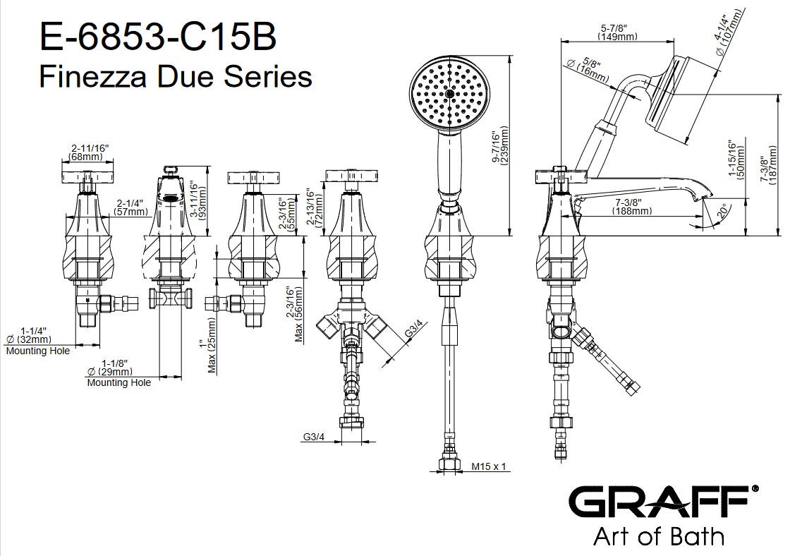 Graff Finezza Due Bateria wannowa 5-otworowa z zestawem prysznicowym Chrom E-6853-C15B