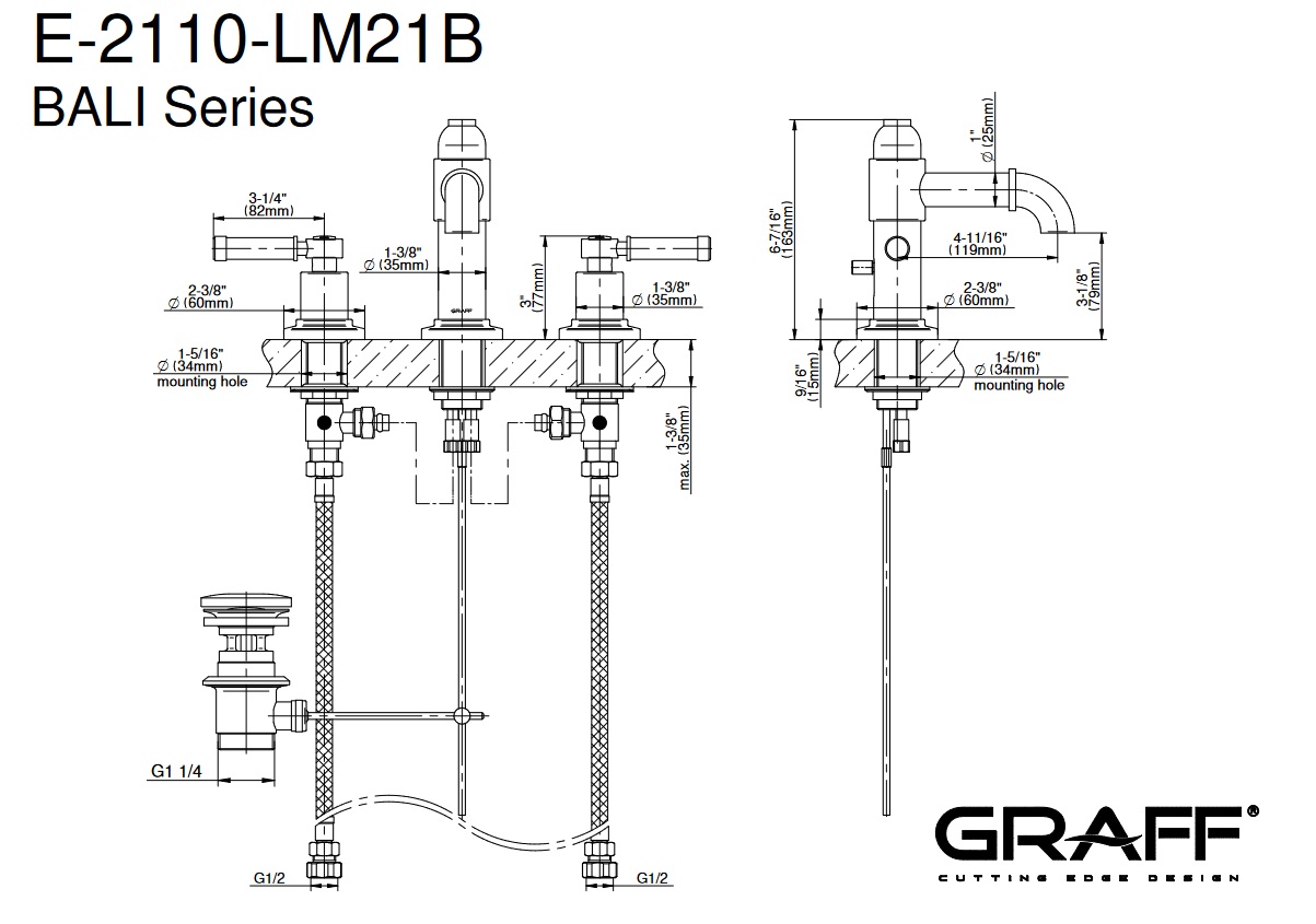 Graff Bali Bateria umywalkowa 3-otworowa z korkiem Chrom E-2110-LM21B