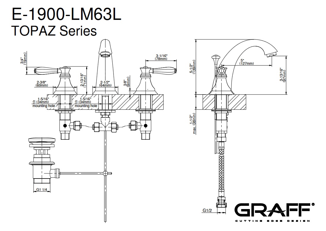 Graff Topaz Bateria umywalkowa 3-otworowa z korkiem Chrom E-1900-LM63L