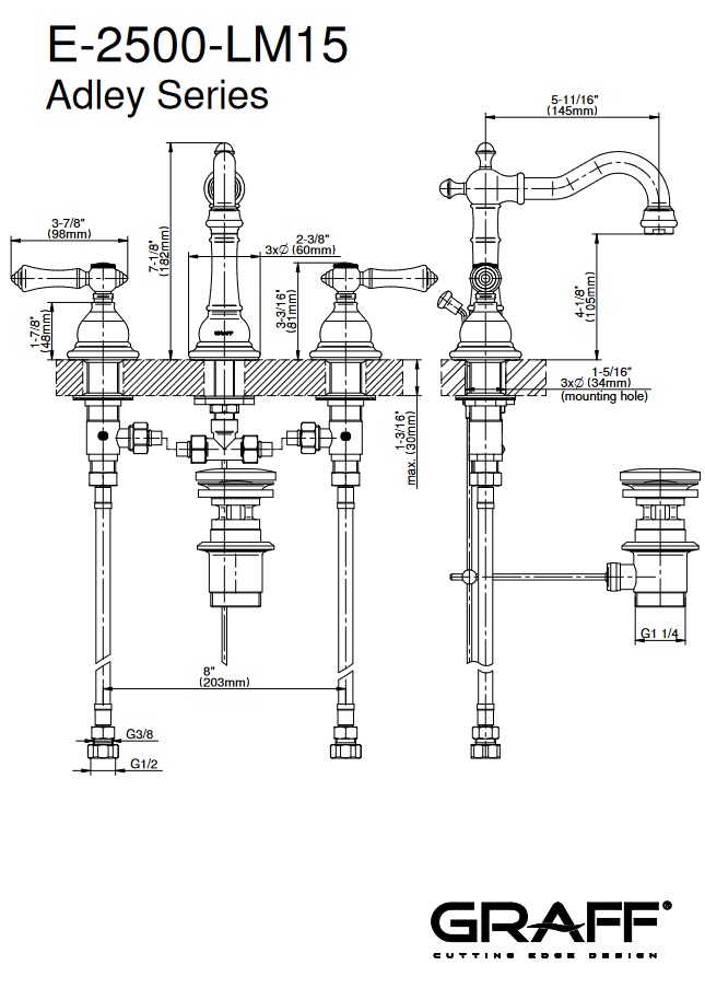 Graff Adley Bateria umywalkowa 3-otworowa z korkiem Chrom E-2500-LM15