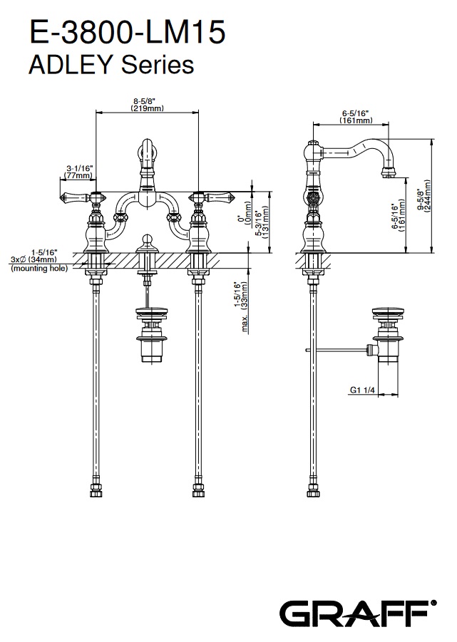 Graff Adley Bateria umywalkowa 3-otworowa z korkiem Chrom E-3800-LM15