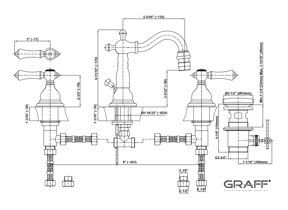 Graff Adley Bateria bidetowa 3-otworowa z korkiem Chrom E-2561-LM15