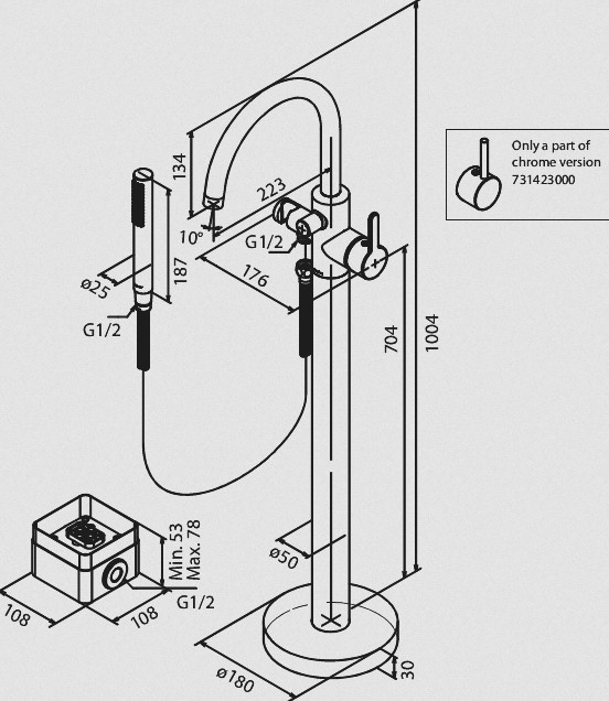 Wymiary: Wysokość baterii: 1004 mm Wysięg głowicy: 223 mm Wysokość głowicy: 134 mm Średnica podłogowego elementu: ∅180 Długość węża: 187 mm Średnica węża: ∅25