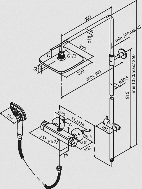Deszczownia 200mm, słuchawka prysznicowa i wąż