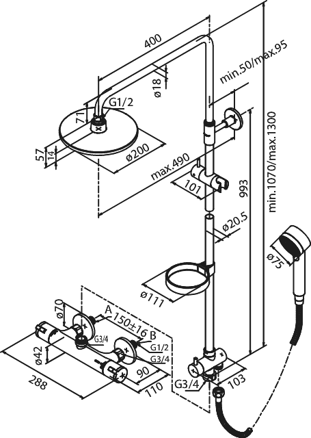 Przepływ wody przez deszczownicę max 12l/min., przez słuchawkę prysznicową max. 9l/min