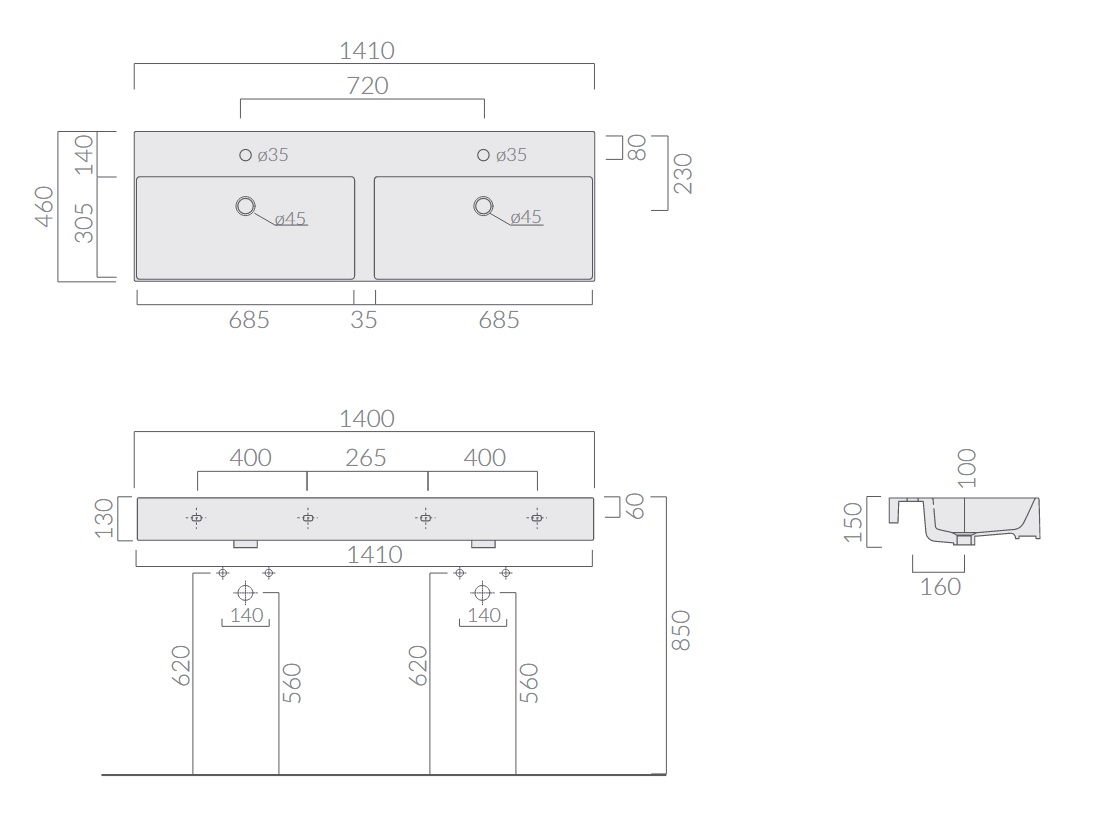 Galassia MEG11 PRO Umywalka dwukomorowa ścienna/stawiana na blat 141x46 cm Biały mat 8939MT
