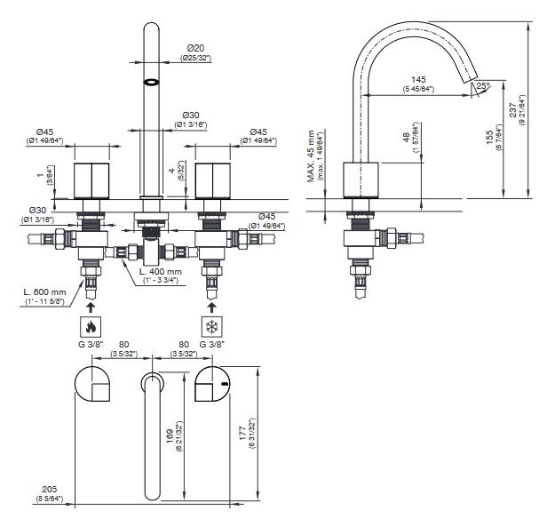 CEA Duet Bateria umywalkowa 3-otworowa z obrotową wylewką Satin Stainless Steel DET15S