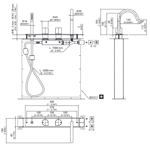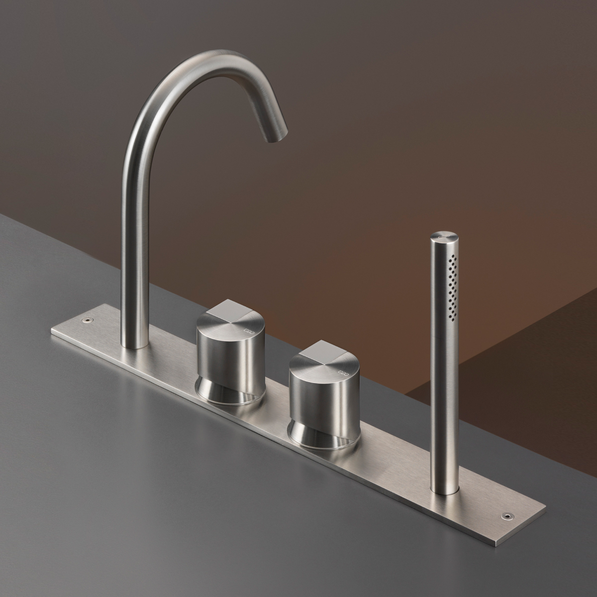 CEA Duet Bateria wannowa 4-otworowa na brzeg wanny z wylewką i słuchawką prysznicową element zewnętrzny Satin Stainless Steel DET32S