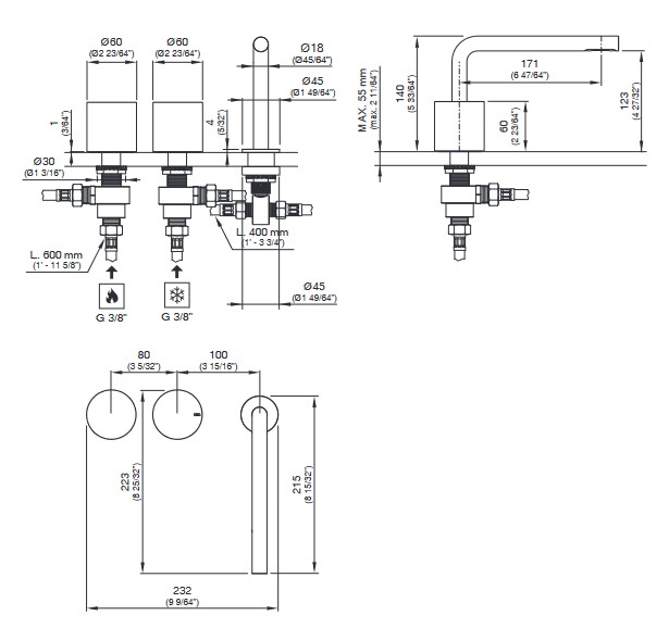 CEA Opus Bateria umywalkowa 3-otworowa z obrotową wylewką Satin Stainless Steel OPS02S