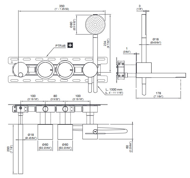 CEA Opus Bateria wannowa ścienna z wylewką, słuchawką i wężem element zewnętrzny Satin Stainless Steel OPS25HWS