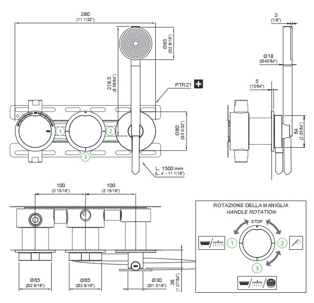 CEA Giotto Bateria wannowa/prysznicowa ścienna termostatyczna z przełącznikiem 2/3-drożnym, słuchawką i wężem element zewnętrzny Satin Stainless Steel GIO54YWS