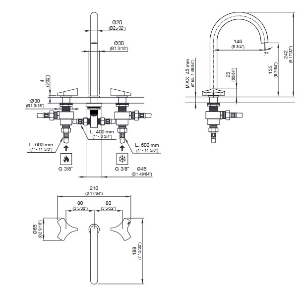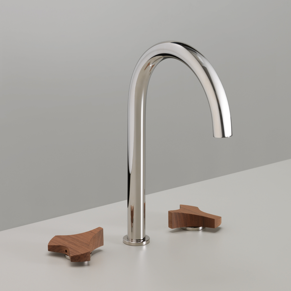 CEA Ziqq Bateria umywalkowa 3-otworowa z obrotową wylewką Satin Stainless Steel+Canaletto Walnut ZIQ12NS