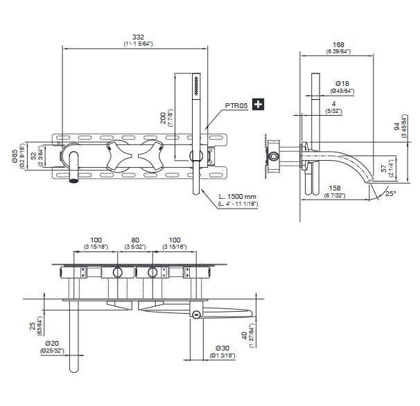 CEA Ziqq Bateria wannowa ścienna z wylewką, słuchawką i wężem element zewnętrzny Satin Stainless Steel ZIQ44WS