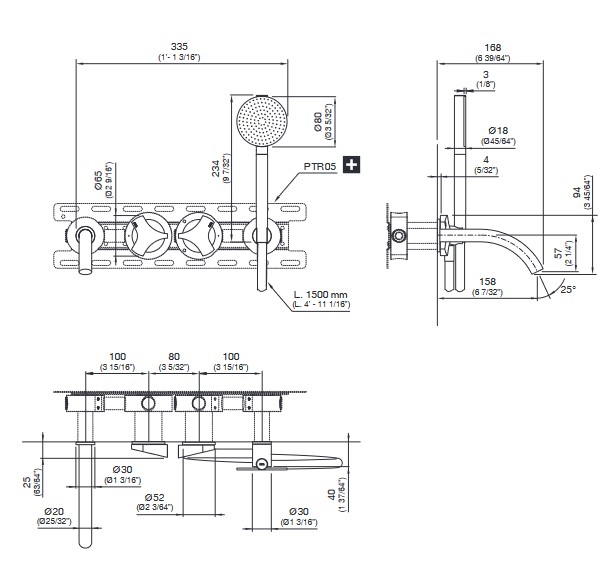 CEA Ziqq Bateria wannowa ścienna z wylewką, słuchawką i wężem element zewnętrzny Satin Stainless Steel ZIQ50HWS