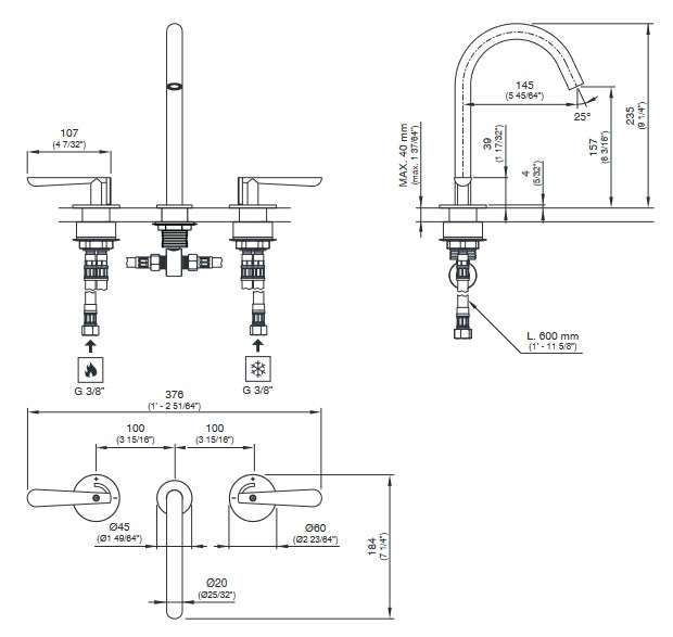 CEA Lutezia Bateria umywalkowa 3-otworowa z obrotową wylewką H23,5 cm Satin Stainless Steel LTZ11S