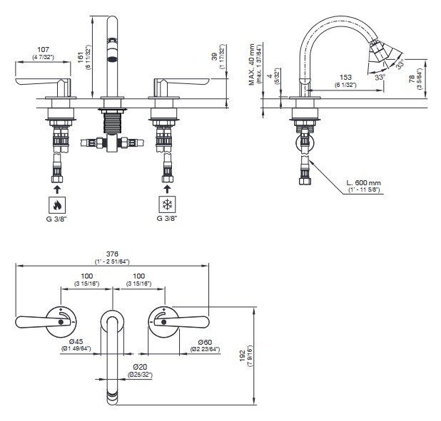CEA Lutezia Bateria bidetowa 3-otworowa z obrotową wylewką H16 cm Satin Stainless Steel LTZ12S