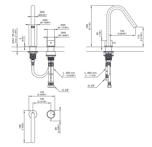 CEA Gradi Bateria umywalkowa 2-otworowa z obrotową wylewką H23 cm Satin Stainless Steel GRA20S