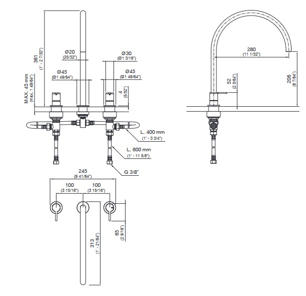 CEA Innovo Bateria umywalkowa 3-otworowa z obrotową wylewką H36 cm Satin Stainless Steel INV45S
