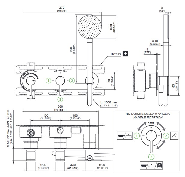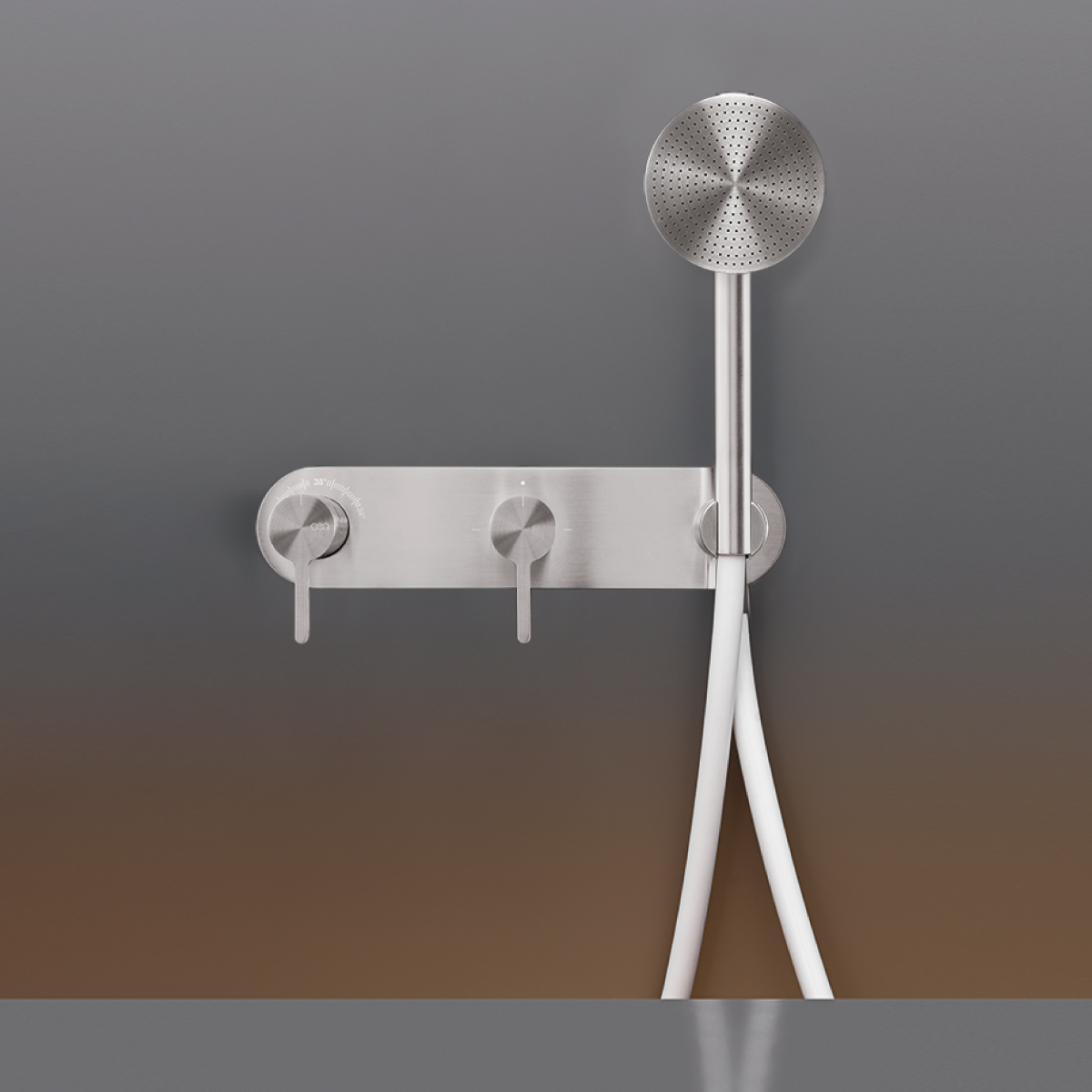 CEA Innovo Bateria wannowa/prysznicowa ścienna termostatyczna z przełącznikiem 2/3-drożnym, słuchawką i wężem element zewnętrzny Satin Stainless Steel INV59HWS