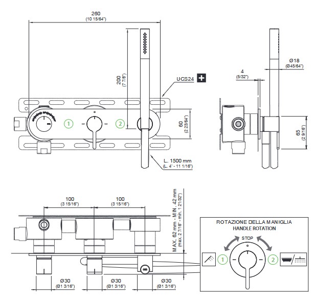 CEA Innovo Bateria wannowa/prysznicowa ścienna termostatyczna z przełącznikiem 2-drożnym, słuchawką i wężem element zewnętrzny Satin Stainless Steel INV50WS