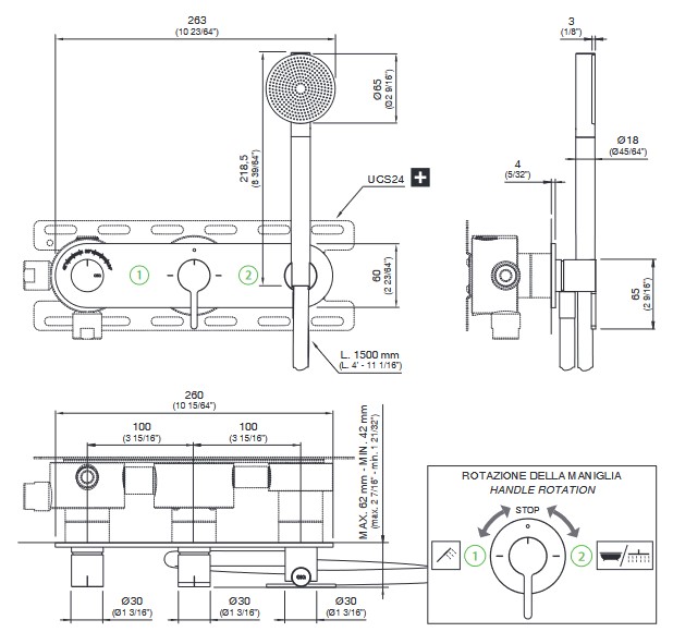 CEA Innovo Bateria wannowa/prysznicowa ścienna termostatyczna z przełącznikiem 2-drożnym, słuchawką i wężem element zewnętrzny Satin Stainless Steel INV50YWS