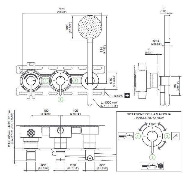CEA Innovo Bateria wannowa/prysznicowa ścienna termostatyczna z przełącznikiem 2/3-drożnym, słuchawką i wężem element zewnętrzny Satin Stainless Steel INV60HWS